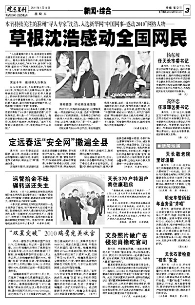 事件回顾:从32岁到42岁,人生最黄金的10年。2001年,滁州寻人沈浩创办寻人启事网站以来,就不停奔走在互联网与现实交织的寻人旅途上。那许许多多和他非亲非故的人,却成为他人生当中最重要的部分。这位草根人物的感人事迹,通过网络等媒体传播开来,让他获得“中国寻人专家”的美誉。 对于沈浩来说,寻人是一个“不快乐的事业”,每天总要面对骨肉分离、亲友难聚的悲伤和眼泪,但是他不能放弃。沈浩说,“当天下无骨肉分离者的那一天,我的网站才可以关闭。” 1月13日下午,新华网“中国网事·感动2010”网络人物颁奖现场,写给滁州“寻人专家”沈浩的颁奖词,让全国网民对沈浩的善良和毅力再生敬意。 记者回访:日前,记者再次与沈浩取得联系,获悉他于12月3日已回到滁州,准备和家人过个团圆年。一年里,除了7月份在家休息外,他一直在外奔波寻人。“经历无数次碰壁,栽过无数次跟头,其中酸甜苦辣咸无人知晓”,但让沈浩颇为欣慰的是,这么多年的不懈努力,已让960多个家庭重获团圆。 (记者包增光)
