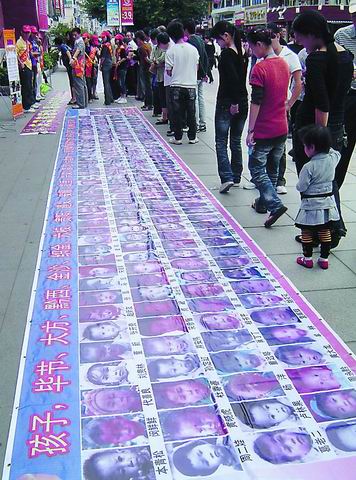 本报讯(记者 蔡晨晖 文/图)10月12日上午,市区步行街古谯楼前,来自贵州寻亲团的8名成员来到莆田,渴望在莆田能够获悉亲人的音讯。 当日上午,古谯楼前,两张摊开在地上的大横幅吸引了不少市民驻足,横幅上印有196名失踪孩子的头像,这些孩子只是贵州数千名失踪孩子中的一小部分。来自我市的几名义工也拉起“义工在行动,爱心在传递”标语,帮助分发寻子扑克、寻子图册。 这个贵州寻亲团于一个星期前来到福州,11日来到莆田,下一步将去泉州、厦门及广东等地,继续寻子万里行。
